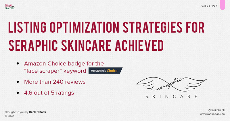 In this post, we’ll share how we helped Seraphic Skincare earn the “Amazon’s Choice” badge under the keyword “face scraper” for their exfoliating facial razors, as well as how we helped them attain many positive reviews after just a couple months of doing a full listing optimization service for their brand. As of today, the newly launched listing already has more than 300 reviews, with a total rating of 4.6 stars.